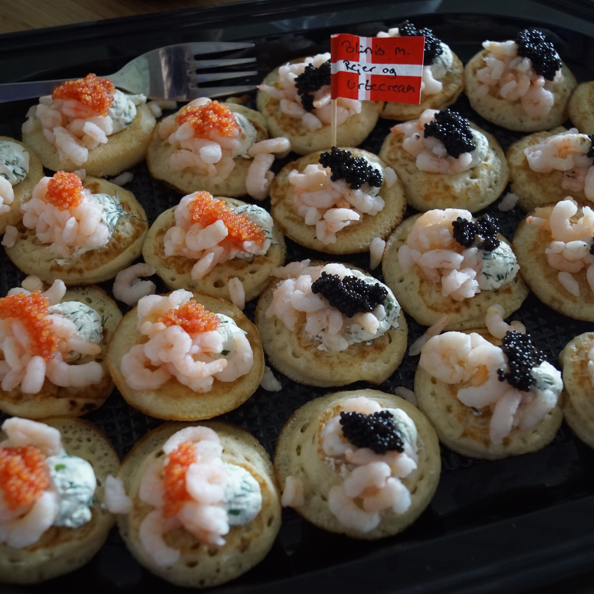 - Blinis med rejer og urtecreame